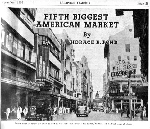 Figure 3: Philippine Yearbook, 1939: “Escolta street, as narrow and almost as short as New York’s Wall Street, is the business, financial, and theatrical center of Manila.” Source: Manila Nostalgia